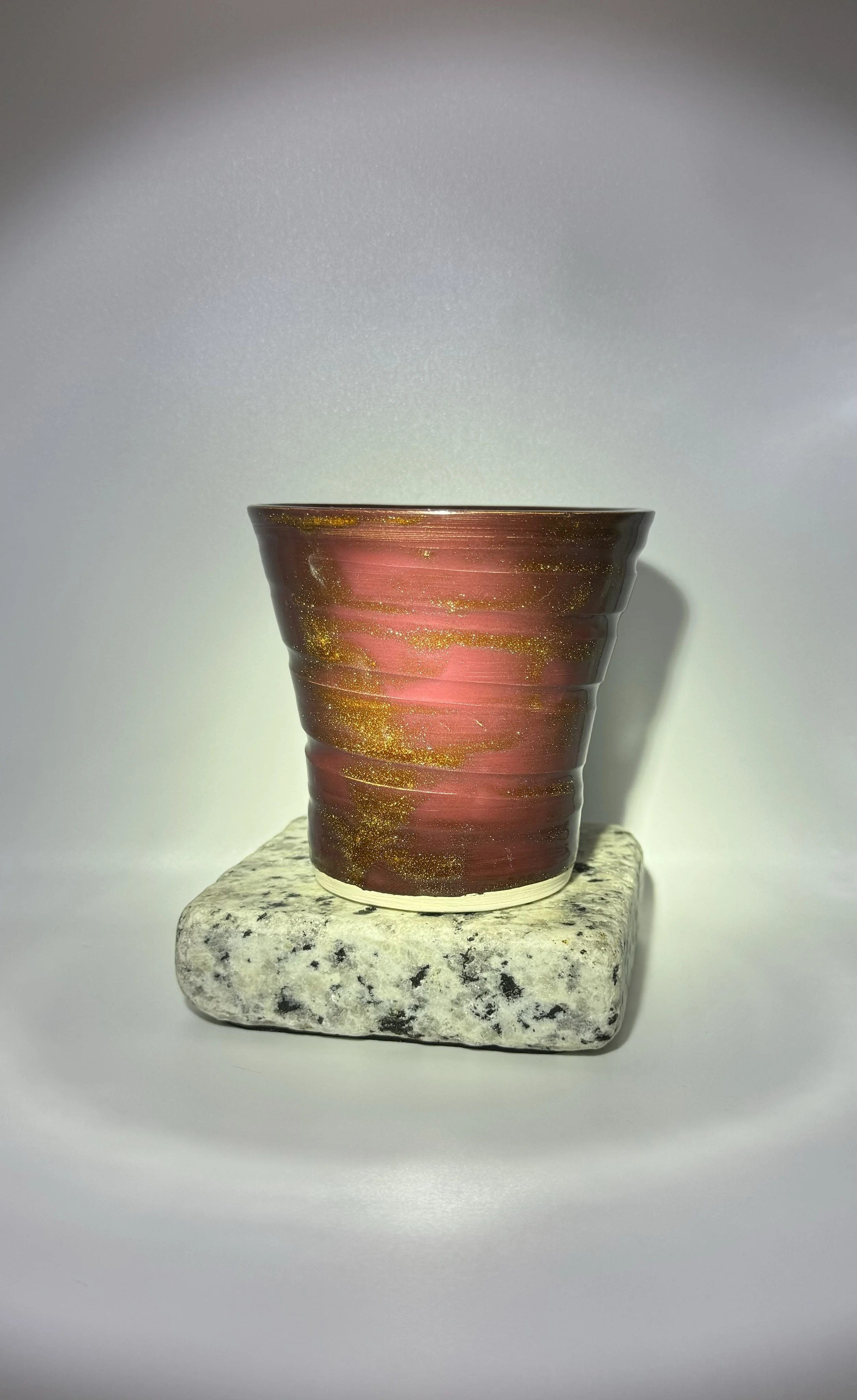 This cup is etched with a swirl design that enhances the richness of the maroon and gold-shimmer glaze. Sparkly all over, this cup is the perfect eye-catching piece for your home.
